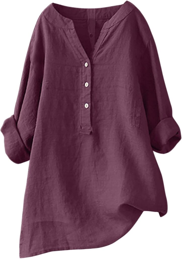 Camisas femininas de algodão e linho 2024 com botões e gola V, manga comprida, blusas estilosas, soltas, confortáveis