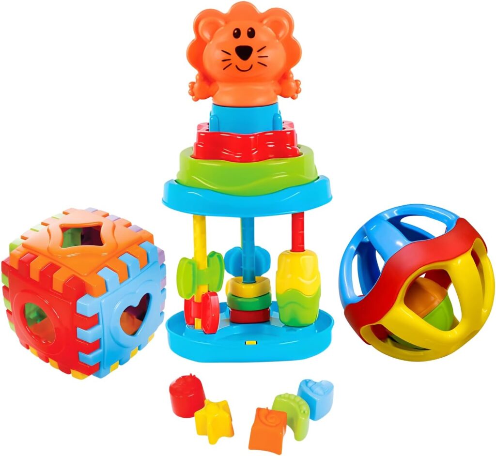 Esse kit de brinquedos educativos estimula o desenvolvimento de bebês e crianças de 1 ano. Feito de materiais seguros e duráveis, contém peças coloridas que encaixam e desenvolvem o senso de coordenação motora fina. As formas geométricas ajudam no reconhecimento de padrões visuais. Além disso, texturas estimulam os sentidos do tato e audição. Um brinquedo ideal para estimular a curiosidade natural das crianças e despertar seu interesse pelo mundo que as cerca.