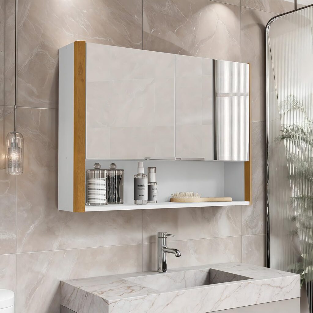 Armário de Banheiro Aéreo 2 Portas Com Espelho Espelheira Com Nicho Santorini (Branco/Nature)