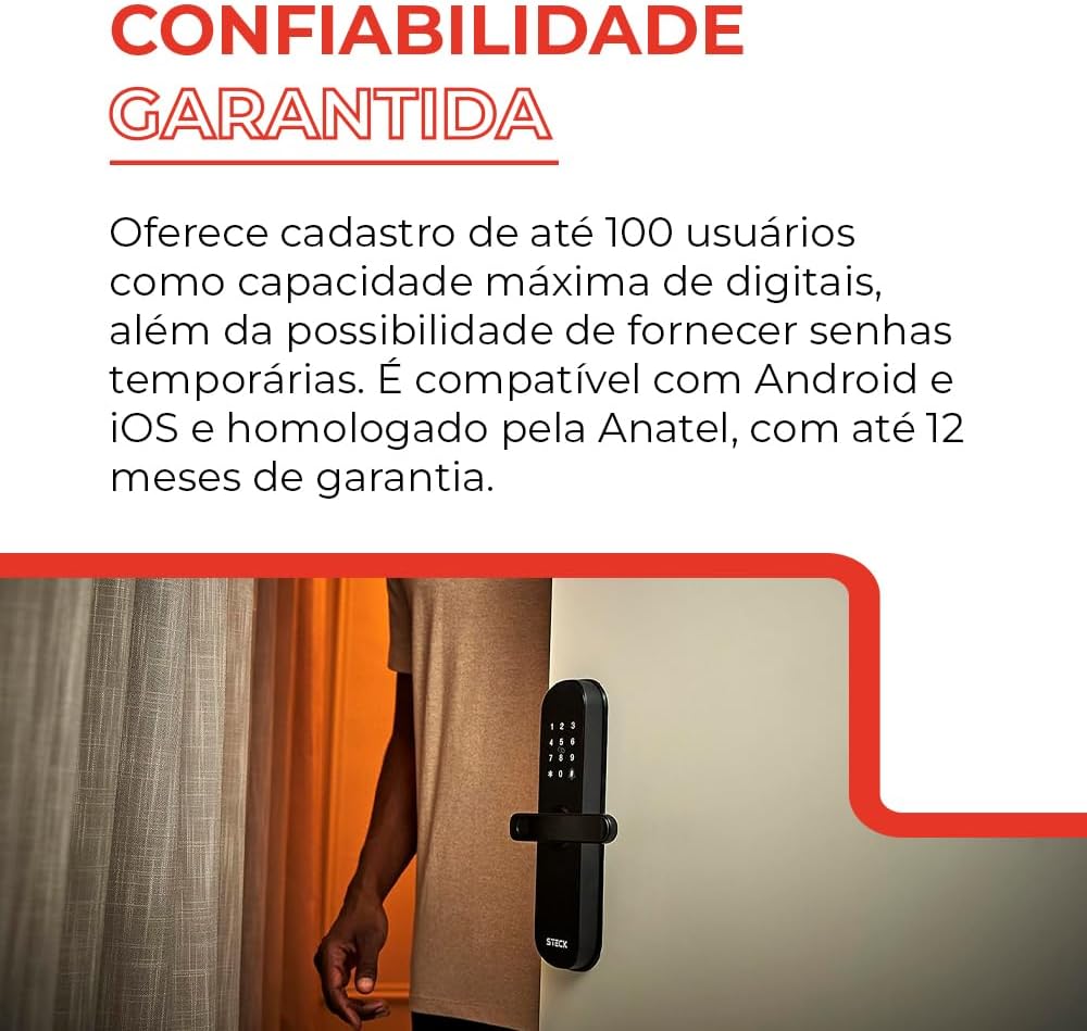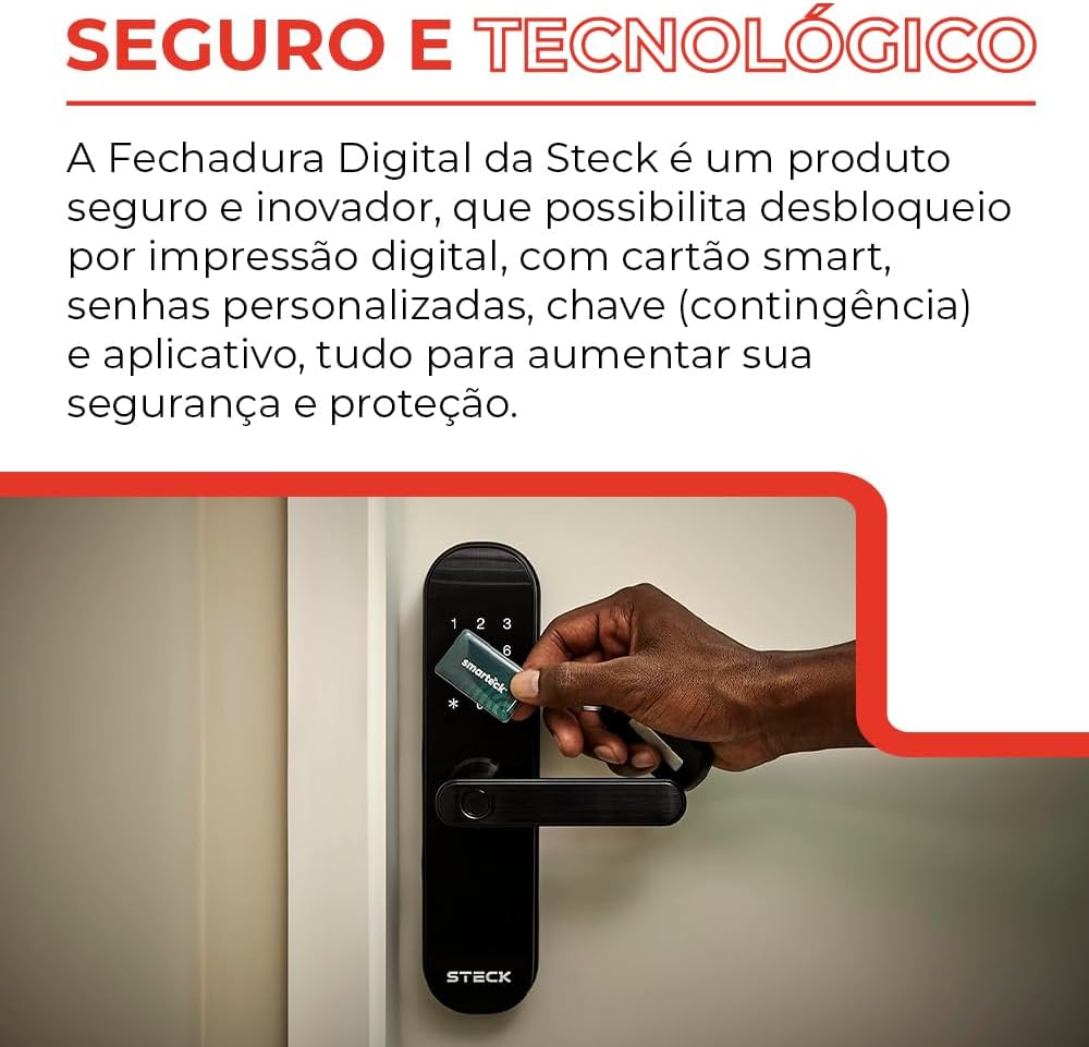 Fechadura Inteligente: segura e tecnológica! A Fechadura Digital é mais um produto com a qualidade da Steck, empresa líder no fornecimento elétrico. A linha possui mais de 15 produtos controlados por único aplicativo, para que você tenha o controle de tudo na palma de suas mãos. Com a Fechadura da Steck, você pode controlar remotamente quem entra na sua casa, com a função de abertura pelo aplicativo, além de possuir: acesso por biometria, senha, chave, cartão e campainha integrada. Pode cadastrar até 100 usuários e fornecer senhas temporárias, para quando você precisar receber um prestador de serviços, por exemplo. E tudo isso de maneira segura. Todos os produtos Steck passam pelos mais rigorosos testes de segurança e qualidade, além de possuírem certificação modular da Anatel, garantindo a segurança para as residências brasileiras.